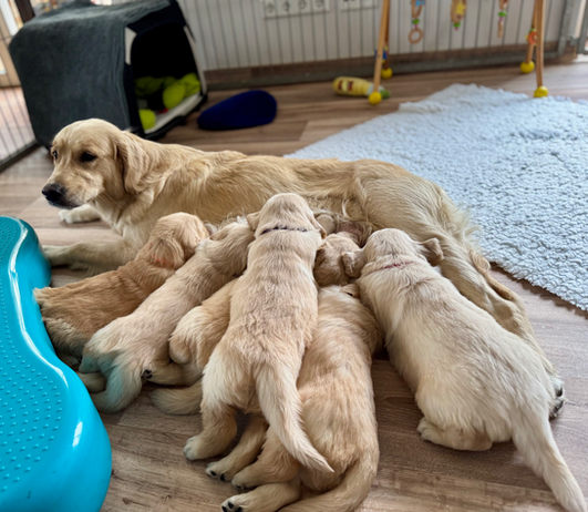 Gestern gab es für unsere sechs Welpen-Damen zum ersten Mal "richtiges" Futter! Eine ganz neue Erfahrung...bisher kannten sie ja nur Muttermilch. Doch alle haben sofort verstanden, worum es geht und die kleine Portion schnell weggeschleckt.