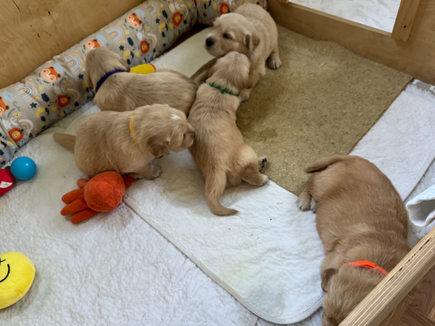 Kaum zu glauben, dass die Welpen bis vor ein paar Tagen noch in der Wurfkiste waren. Inzwischen nutzen sie das große Gehege im Wohnzimmer für ihre ersten Sprintversuche - und sobald sie wach sind, wird gespielt. Alle sind unglaublich neugierig und interessiert.